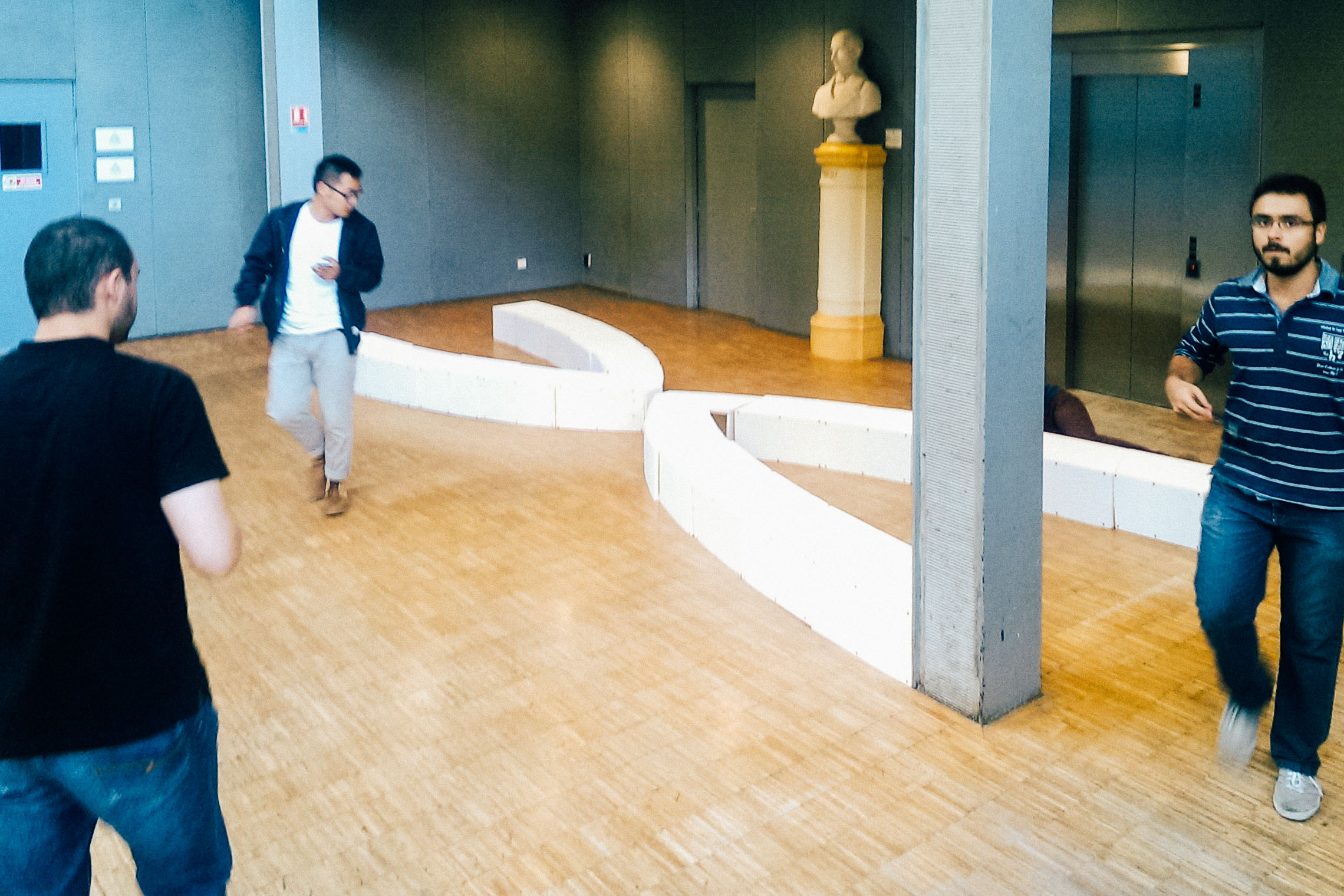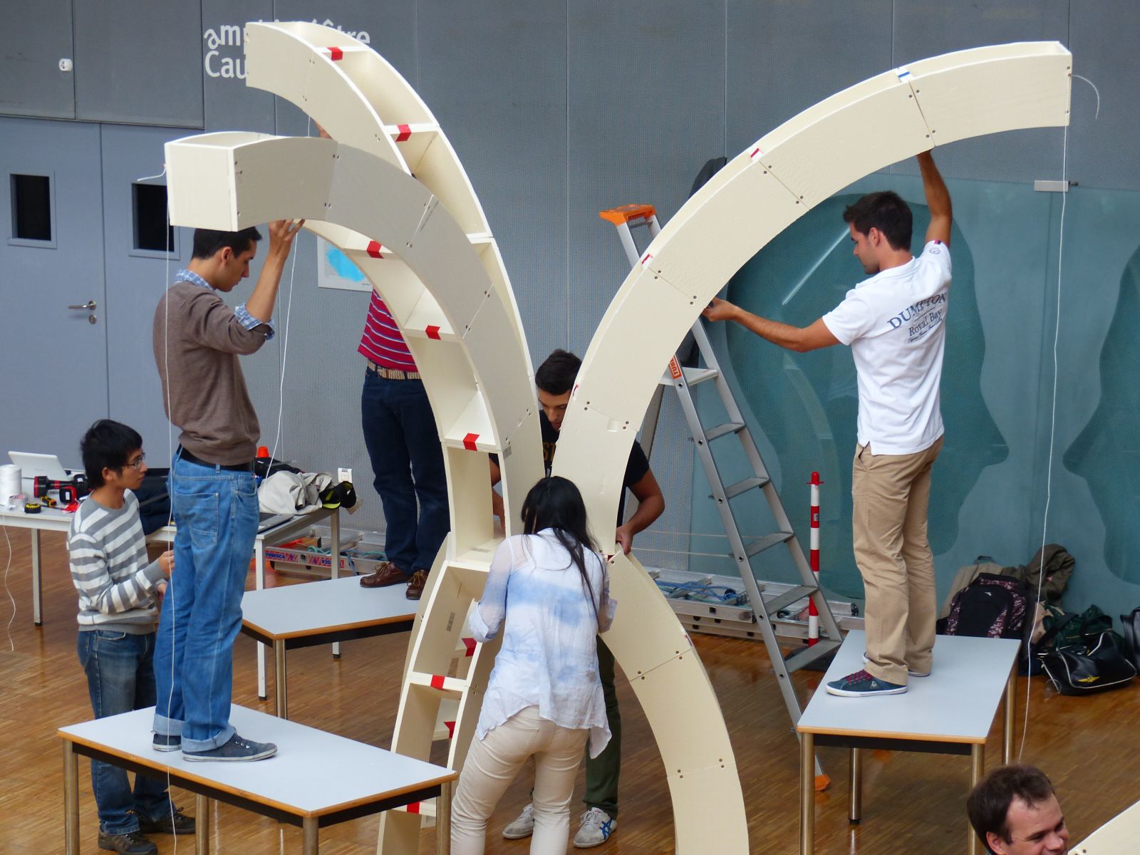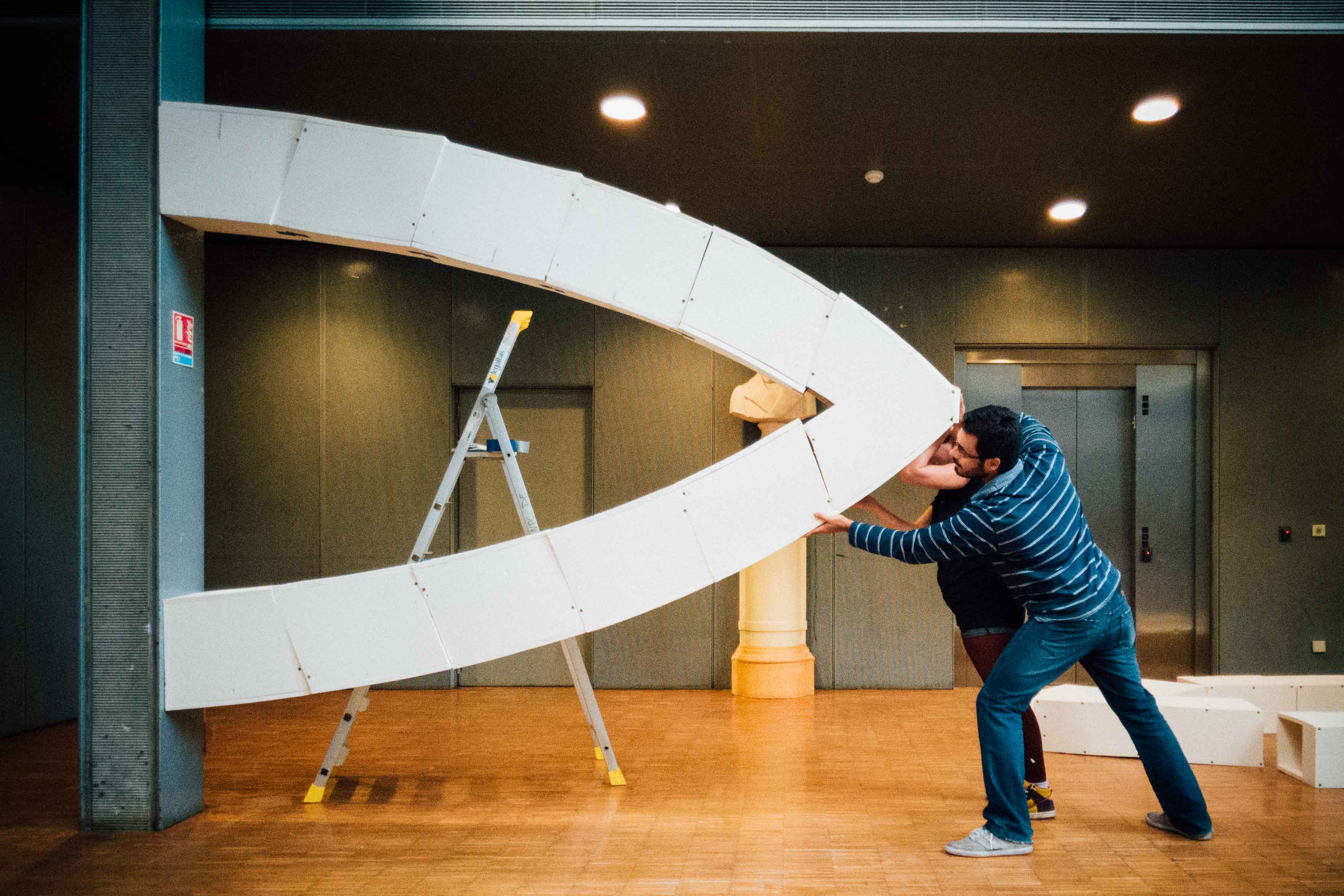 Given such goals the team performed friction and deformation tests on the arch material as well as on the connecting ball, which for the purpose of the workshop were chosen to be polystyrene and a volleyball, respectively. The project that was to be light and dynamic ended up being difficult to build in situ. Two hangers were installed provisorily to maintain the arch while the required pressure was not acquired.