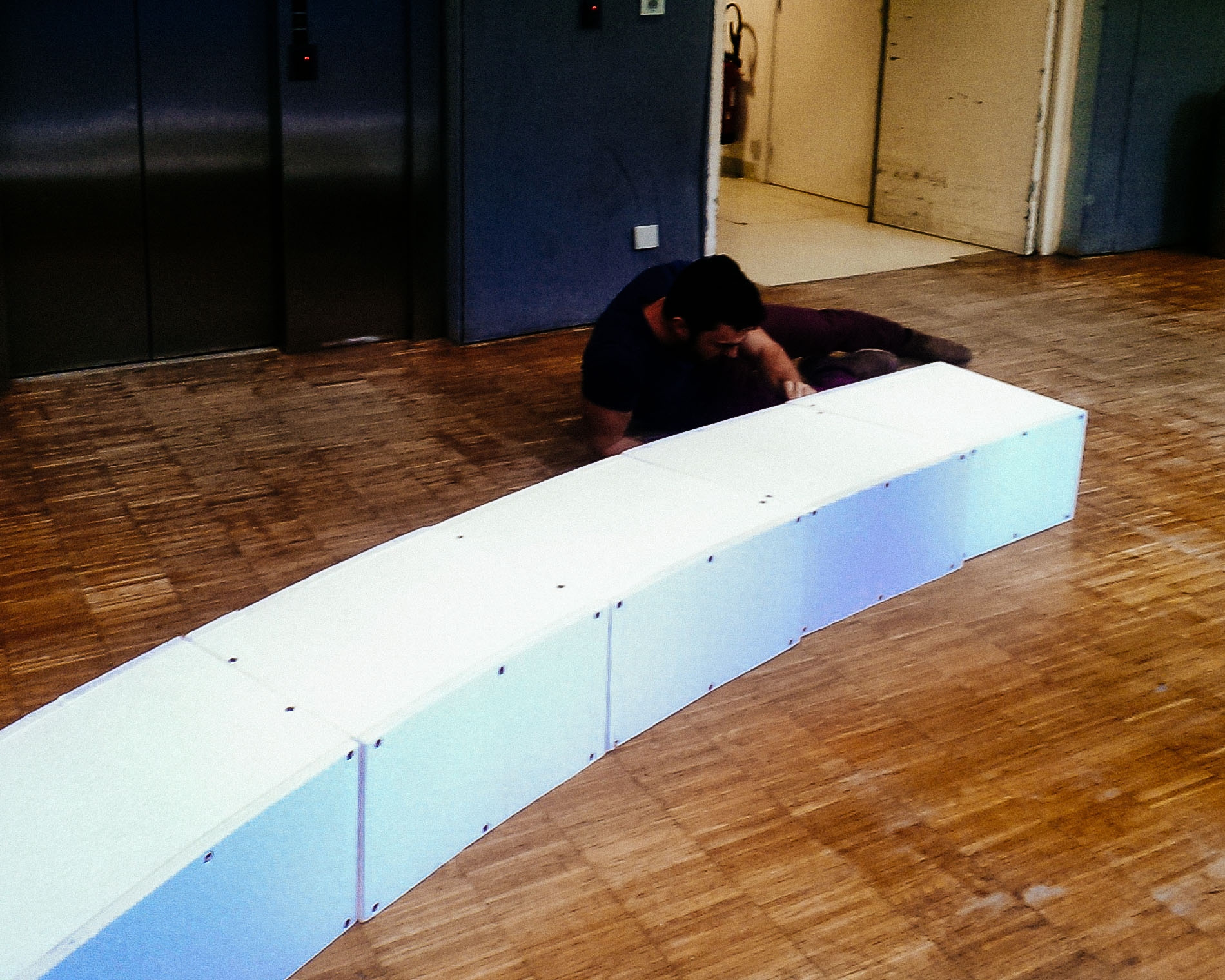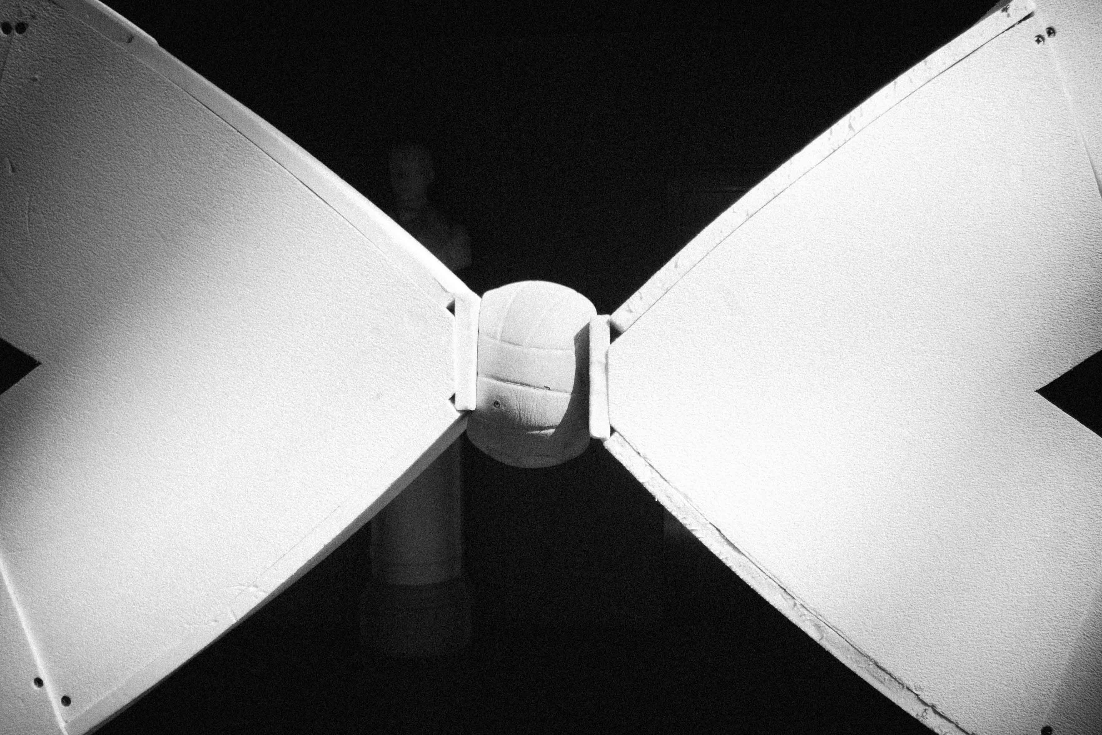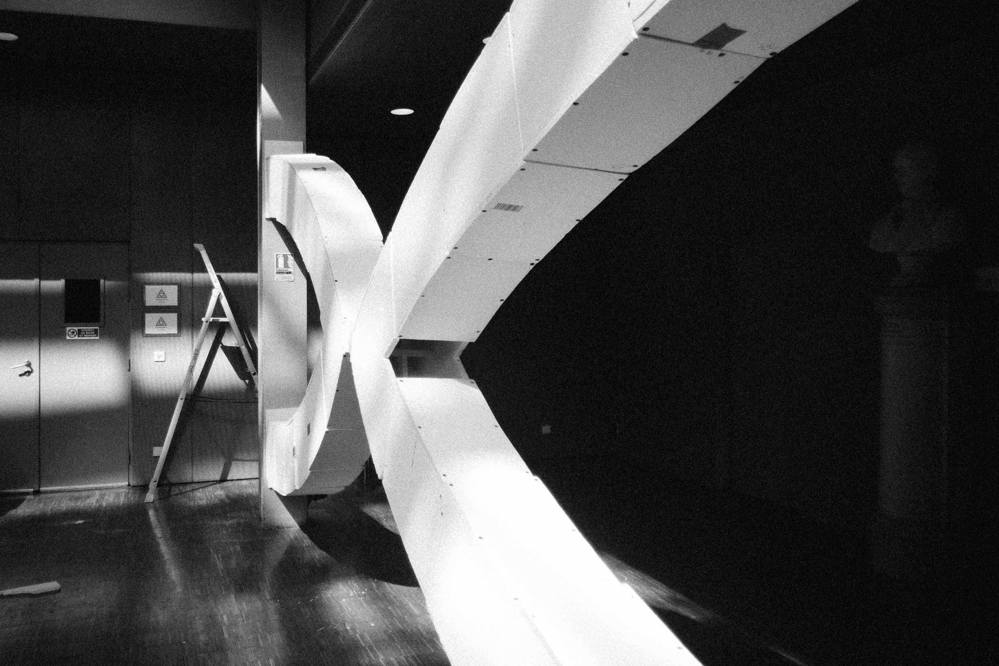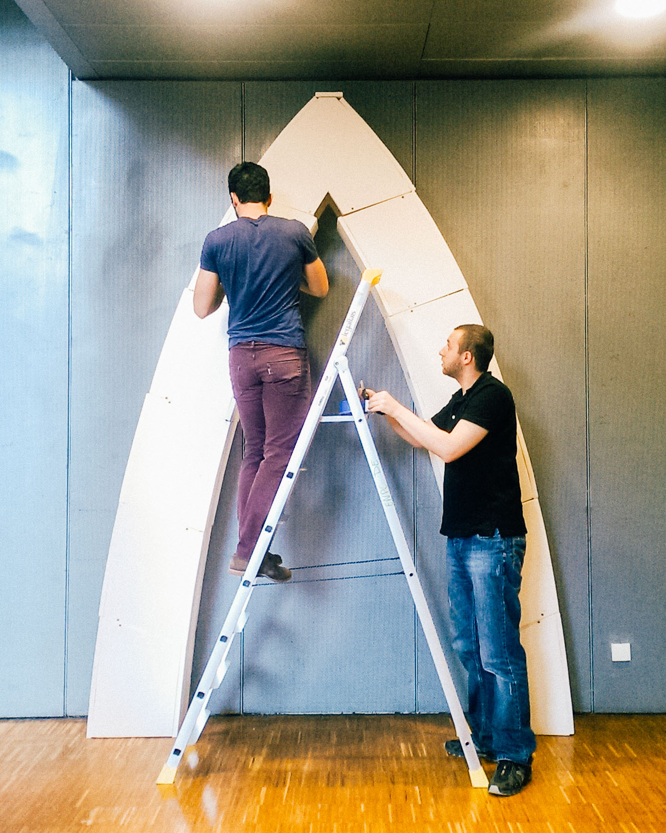 Given such goals the team performed friction and deformation tests on the arch material as well as on the connecting ball, which for the purpose of the workshop were chosen to be polystyrene and a volleyball, respectively. The project that was to be light and dynamic ended up being difficult to build in situ. Two hangers were installed provisorily to maintain the arch while the required pressure was not acquired.