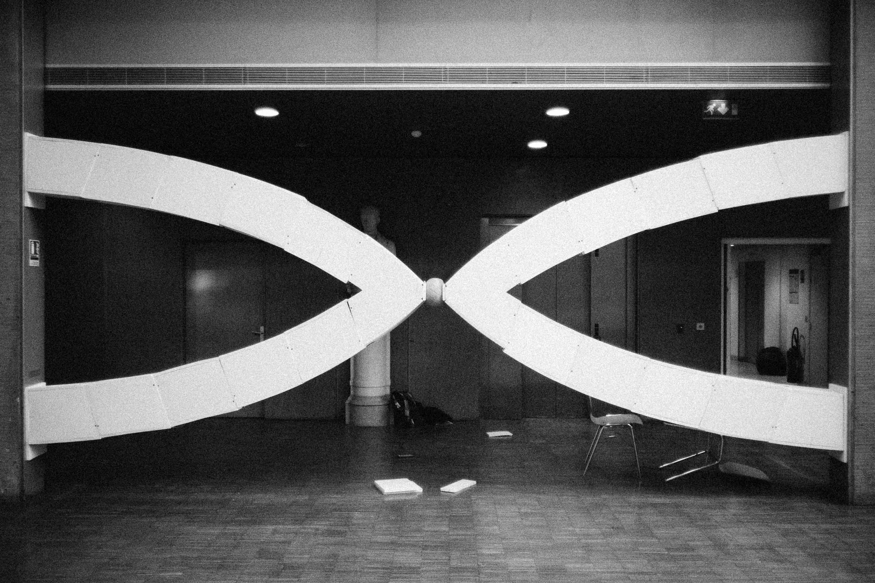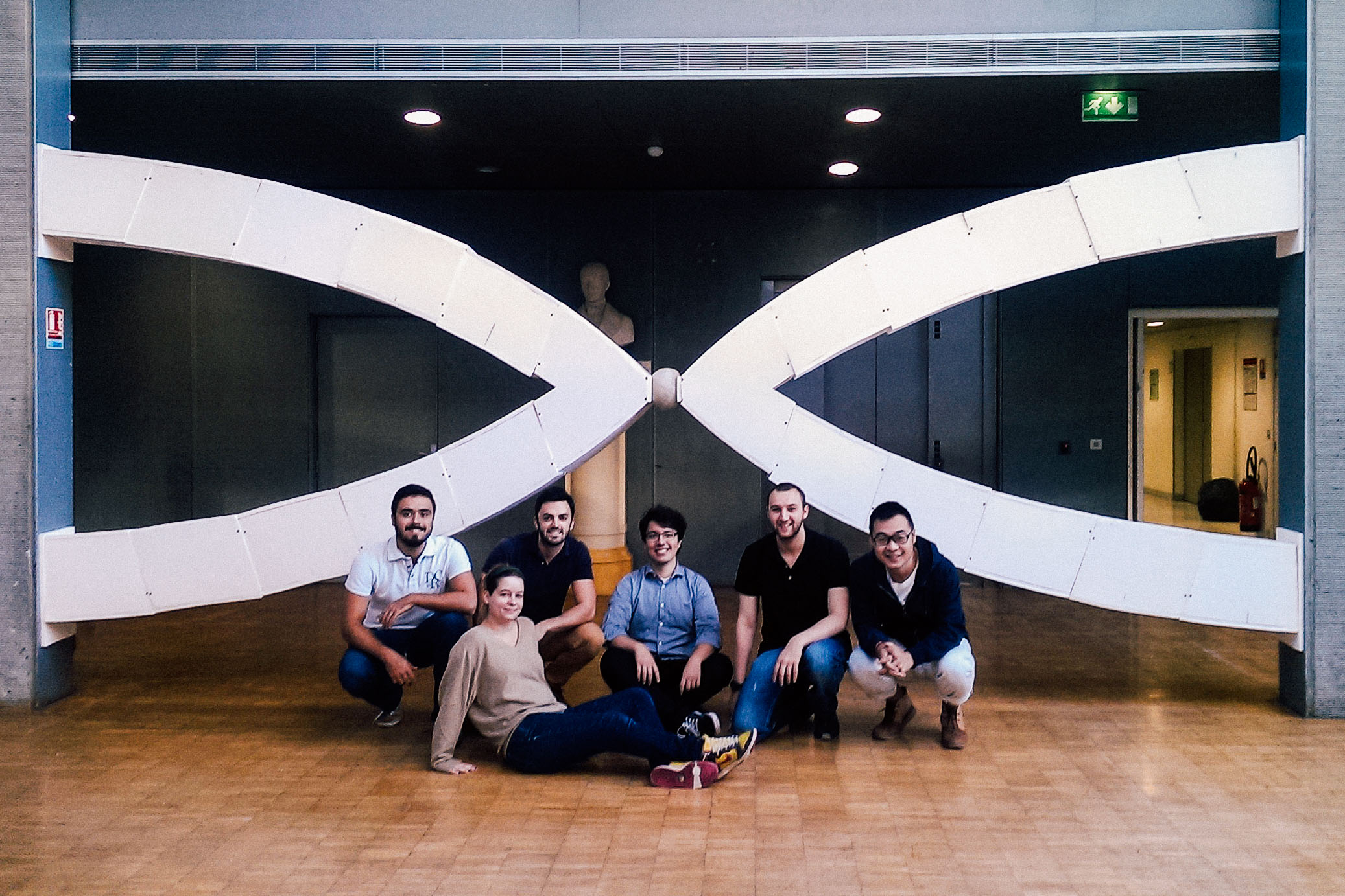 The multicultural team, made mostly by students on a double degree, wanted to work on the concept of a group of arches that would support each other between to vertical elements, crossing hence a large distance (more than 6m). The general idea was to hide the funicular shape through an audacious combination of two arches connected with a spherical element. To achieve such seemingly unnatural behaviour the pressure from the ball transferred to the arches would have to be orders of magnitude more important than the self-weight of the elements of the structure. This would allow the arches to have a mechanical behaviour similar to the domes of the ancient gothic buildings.