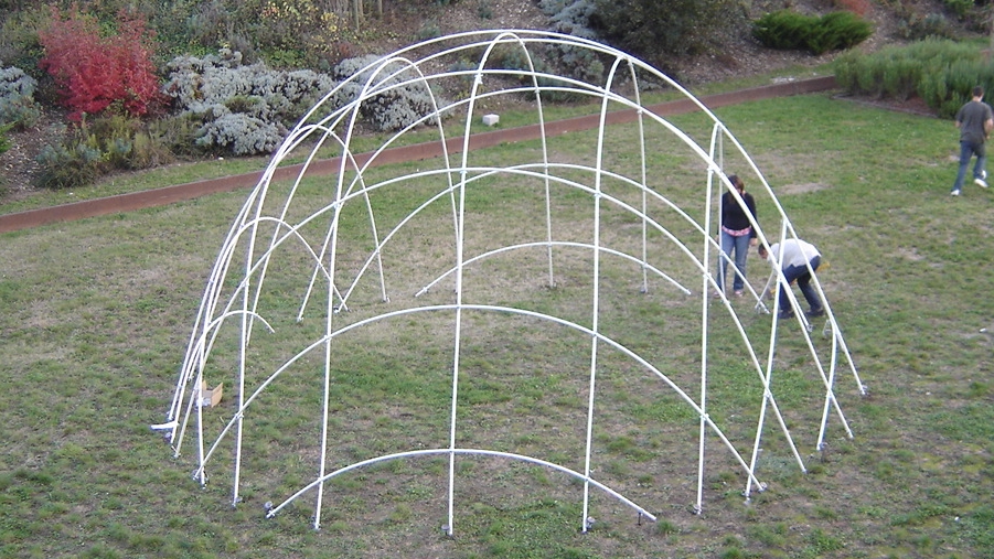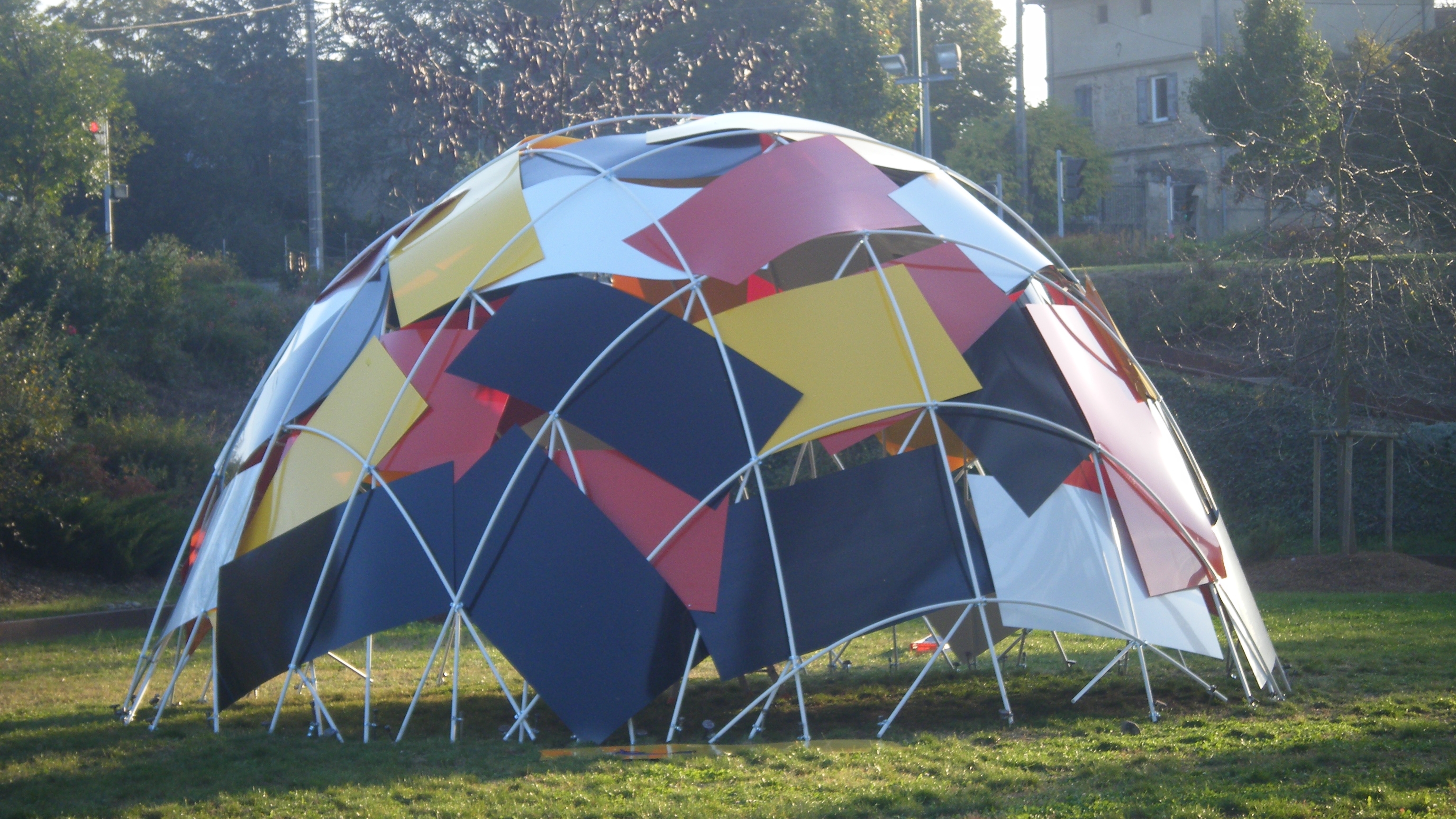 During the Plastic Week organised at the Grands Ateliers de l’Isles d’Abeau, a group of students of Toulouse Architecture School has built an elastic gridshell in glass fibre reinforced polymers and covered it with plastic tiles and a textile roof. Plans of the structural grids are developed at the laboratoire Navier, and the cutting pattern of the cover was drown by N. Pauli.